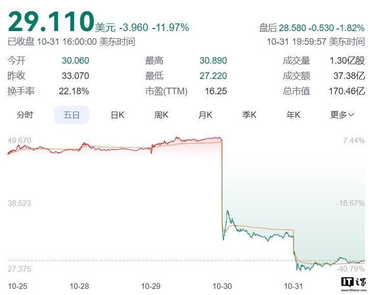 截至10月31日收盘,超微电脑股价再次下滑近12%,报于29.11美元,市值进一步缩减至约170亿美元。