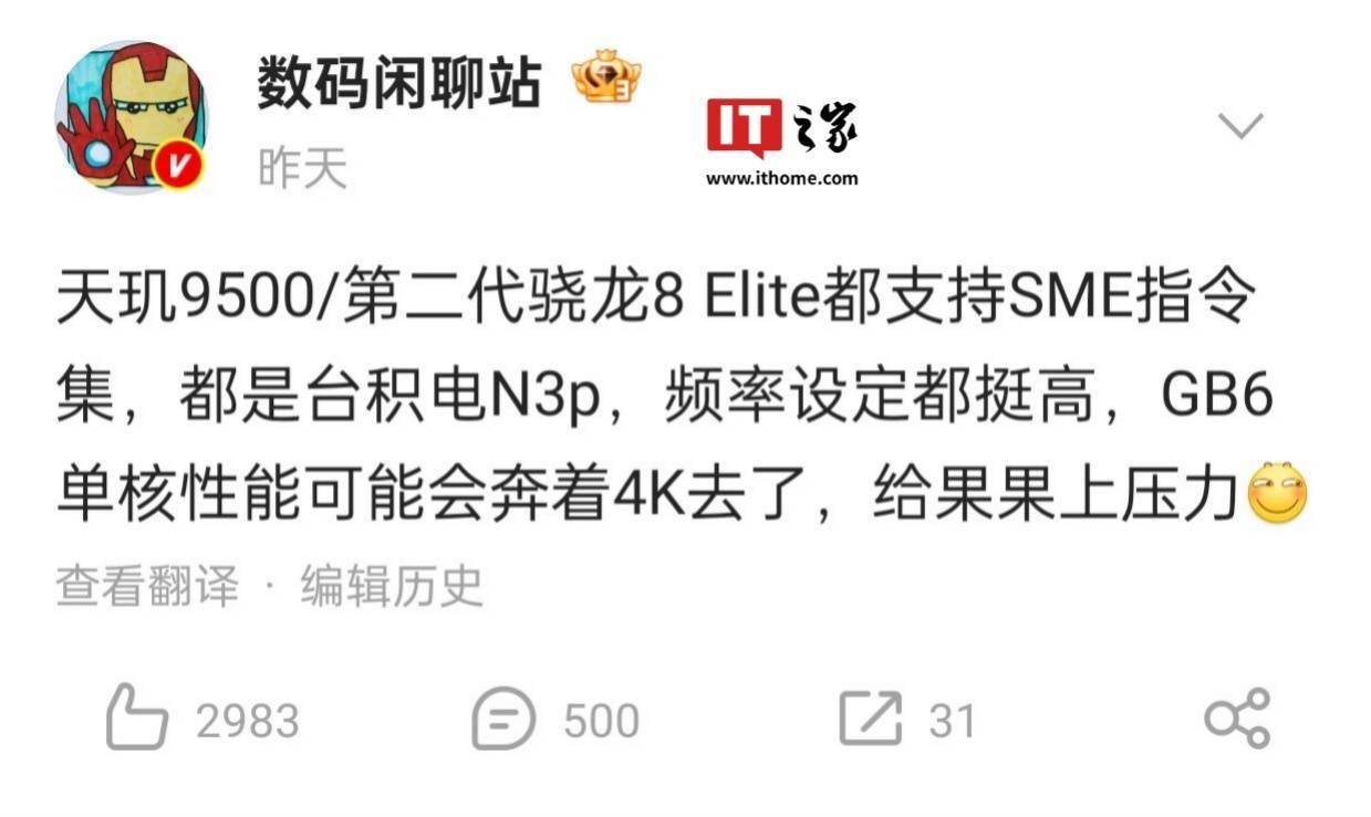 近日,有关高通骁龙8至尊版gen 2与联发科天玑9500两款旗舰芯片的信息引起了广泛关注。据知名数码博主@数码闲聊站透露,这两款芯片均采用了台积电最新的n3p工艺,并支持sme指令集。
