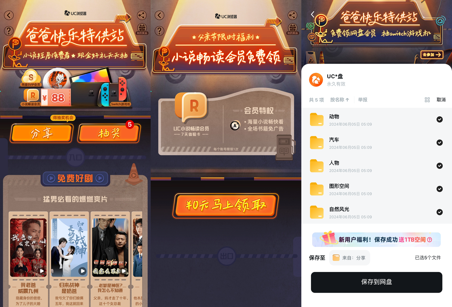 据悉,6月10日至6月19日,在uc浏览器内搜索“快乐特供”或是通过其他官方活动入口,即可进入【爸爸快乐特供站】领取热门短剧、小说故事书单等免费娱乐福利。此外,uc还准备了switch游戏机、现金红包、限量周边等福利好礼,用户参与分享互动即可获得抽奖机会。
