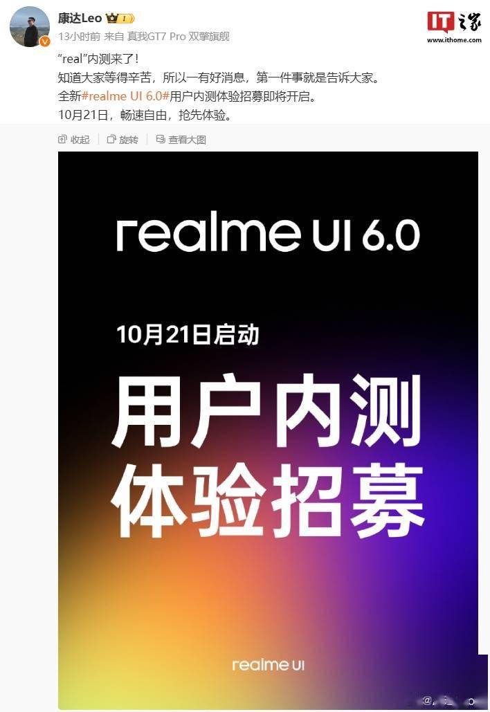 realme ui的产品经理@康达leo在社交媒体上透露,realme ui 6.0的内测体验招募活动将于10月21日正式启动,预计招募将覆盖那些支持在11月进行升级的机型。