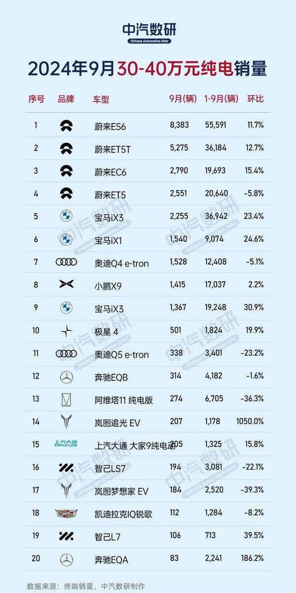 30-40万元区间,蔚来包揽前四,销量远超宝马、奥迪等传统豪华品牌。40万元以上,极氪009以3539辆的销量领先,国产车型占据榜单主导地位。