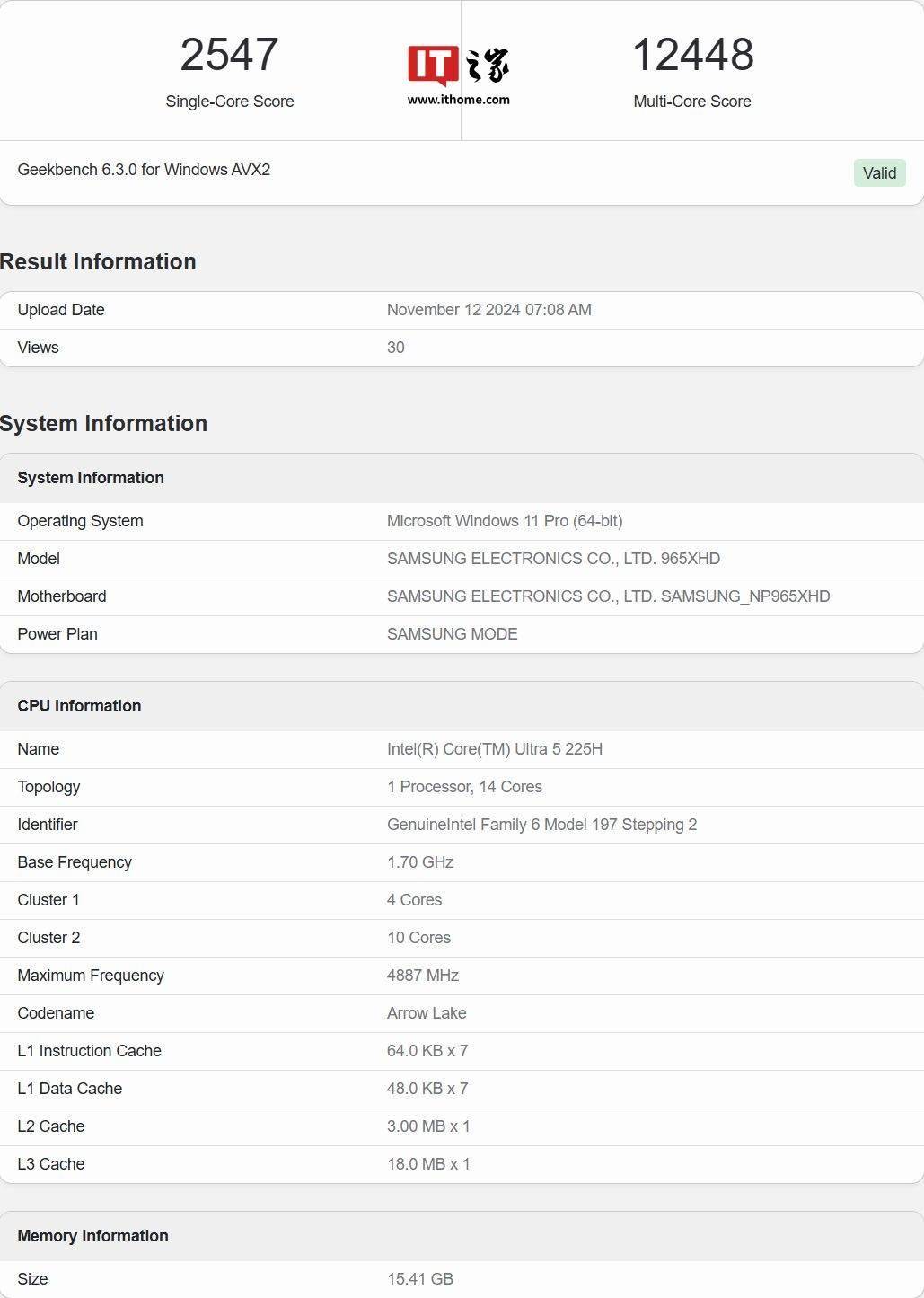 在cpu性能方面,酷睿ultra 5 225h同样表现出色。在geekbench的单核测试中,它获得了2547分的成绩,而在多核测试中则得分12448分。这一性能表现略优于酷睿ultra 5 155h,后者在相同测试中的得分分别约为2200-2300分和1.1~1.2万分。