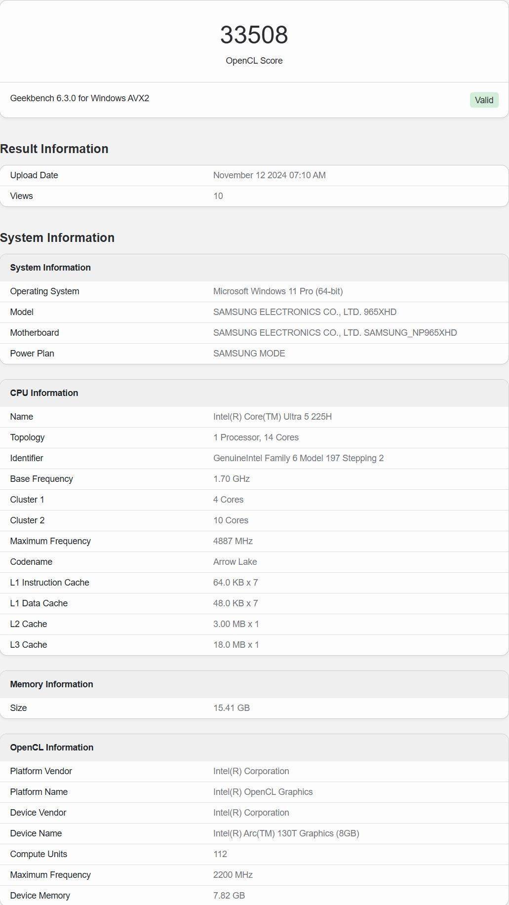 在geekbench的opencl测试中,arc 130t展现出了令人瞩目的性能,获得了33508分的高分。这一成绩相较于arc 140v(16gb)有着显著的提升,后者在相同测试中的最高得分仅为27109分,arc 130t领先幅度高达24%。