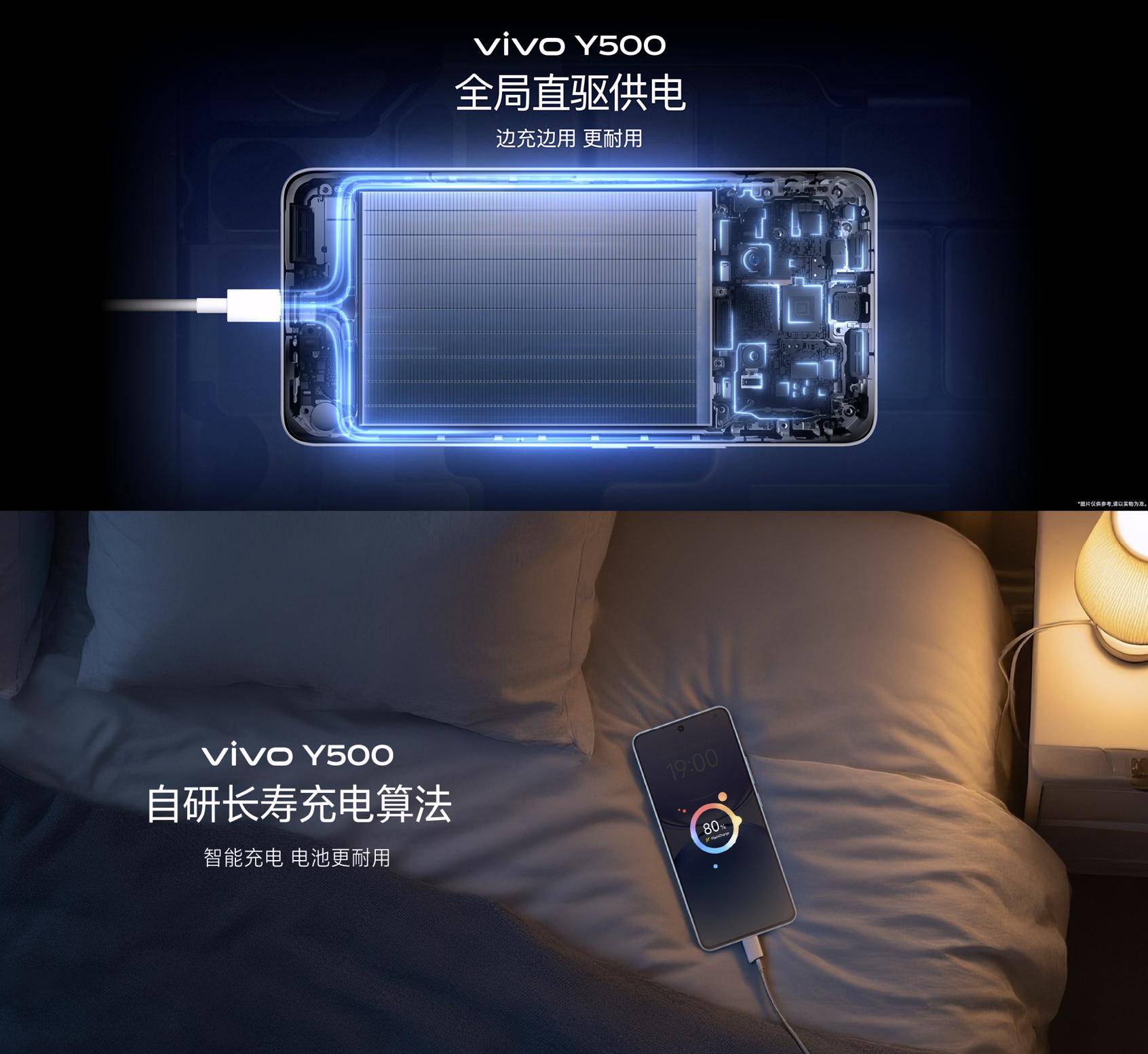 除了续航能力,vivo y500在电池寿命和充电安全方面也下足了功夫。该机型提供了长达6年的电池寿命保障,并赠送四年电池宝服务,大大降低了用户长期使用中的后顾之忧。同时,24重充电保护与全局直驱供电技术的加入,使得用户在边玩边充的场景下,也能有效减少手机发热和电池损耗,进一步提升了整体使用体验。